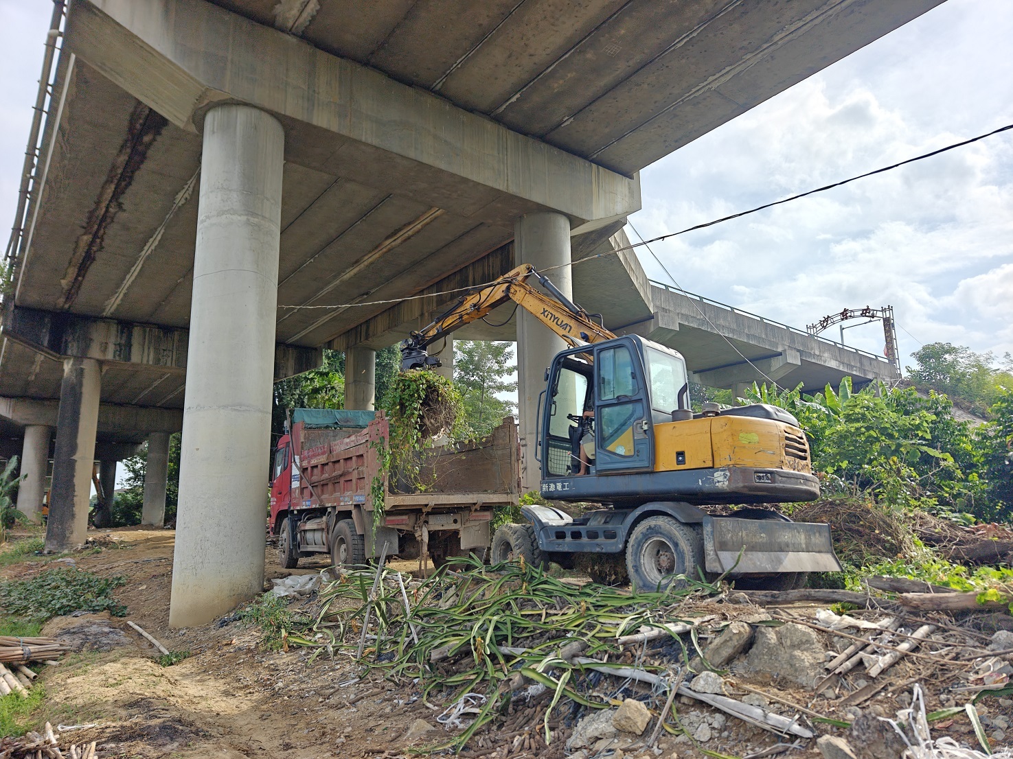 田东公路养护中心养护人员在辖区省道306线祥周右江大桥底清除堆积杂物。